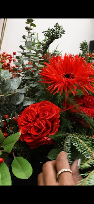 A festive mix of seasonal blooms and fresh winter greens, designed to bring warmth and cheer to your home.